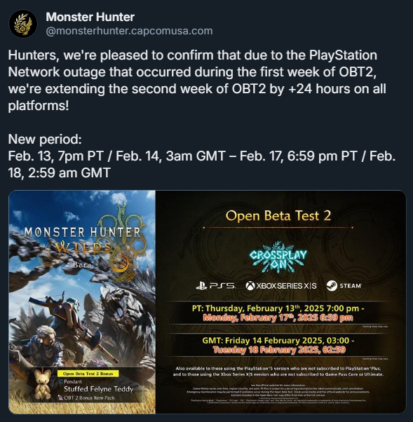 In a move of awesome proportions, Capcom extends the next open beta test for Monster Hunter Wilds for all platforms. This move is in response of PSN players being shut out due to the PSN outage over this past weekend. The beta test will end on the following Tuesday. As always I would like to give Capcom and the Monster Hunter team a hand clap of praise for doing a very pro-player move. I can’t wait run for my life while hunting the new flagship monster, Arkveld. Below is the bluesky post about the change or you can click here