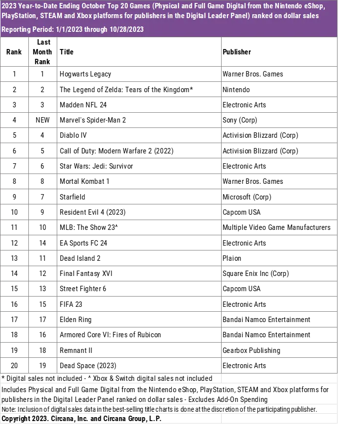 But before we bring out the charts, you may notice a certain writer missing. Alan Wake 2 is not on the charts because Epic Games is “not part of the DLP”. That means we won’t be seeing any digital sales numbers from them. Apparently, the game didn’t make much of a splash on console, either. Circana’s Player Engagement Tracker didn’t pick it up from the “top 150 titles on either PS5 or Xbox Series X/S” for the month.