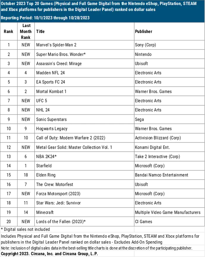 Super Mario Bros. Wonder came in at number 2. Following behind was Assassin’s Creed Mirage, Madden NFL 24, and EA Sports FC 24, in that order. Last month’s champion, Starfield, fell down to 14th.