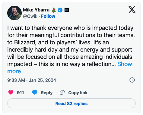 On top of that bombshell, Blizzard president and Microsoft re-hire Mike Ybarra will be leaving. Microsoft will be naming a new president next week.
