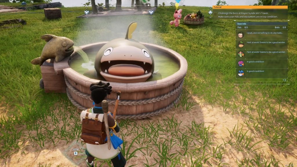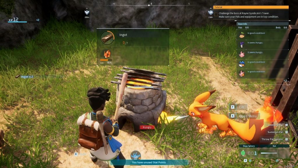Now I just want to make this clear. This is not “Pokemon with Guns”, this is like Ark with Pokemon so to speak. So you gotta focus on hunger, temperature, armor and the like. Story is super simple: You are find yourself on a island inhabited by human and these creatures called Pals. Near your feet is a tablet saying that; the towers are the key. Each tower is inhabited by leaders of the Syndicate. During your journey, you can build a base, workbenches and start capturing Pals who can work in your base. Each Pal have different abilities such as: Handiwork, Watering, Kindling, Transport. Now I’m not about to get into the legalities of the Pal designs. Do I see the similarities between Pals and Pokemon, sure. Is that enough for legal action, I could not tell you. So far, I like the designs and they showcase the varieties of each type
