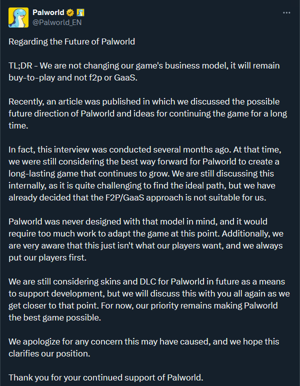 Palworld devs revealed today on Twitter that their game will continue to not be free to play nor, GaaS (or Games as a Service aka Live Service Game). While they haven’t figured out the plans for DLC or cosmetics, they are committed to their current business model and will keep players informed about any upcoming changes. You can read the full tweet below.