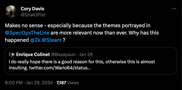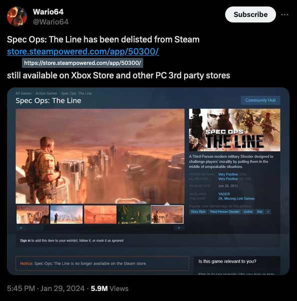 It was discovered on January 30 by Wario64 on Twitter that Spec Ops: The Line was delisted by Steam. While it was only Steam at the time, it is now removed everywhere.