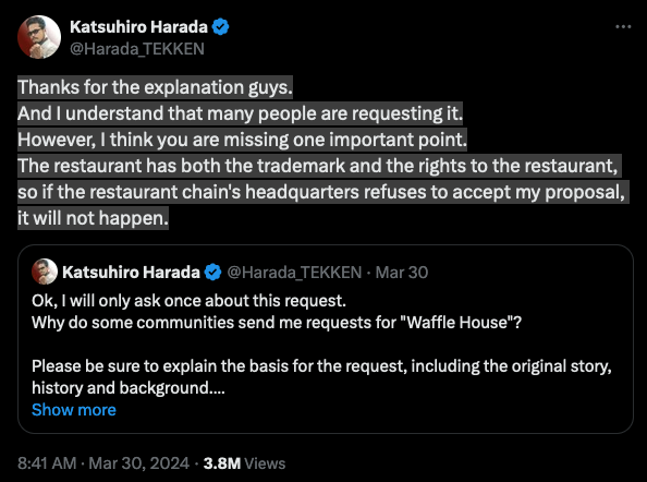 So, its with stories like this that people want to see a the restaurant as a Tekken location. People have gone as far as pressing Tekken producer Katsuhiro Harada to add it to the game. And you got to love Harada for responding to the fans.